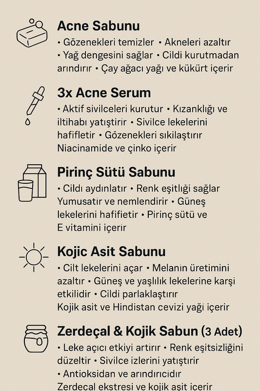 Acne sabunu 3x acne serum & pirinç sütü sabunu kojic asit sabunu zerdeçal ve kojik 3 adet
